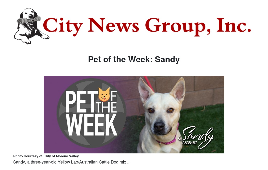 If you would like to make Sandy or any pet from the Moreno Valley Animal Shelter part of your family, please contact the Moreno Valley Animal Shelter at 951.413.3790 or visit www.moval.org/pets