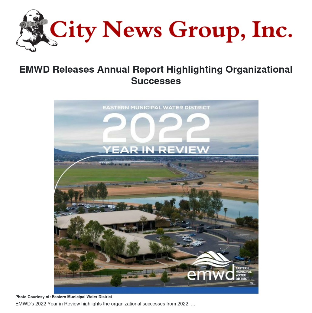Eastern Municipal Water District released its first-ever annual report, highlighting its 2022 accomplishments in providing services to its nearly 1 million customers throughout western Riverside County.