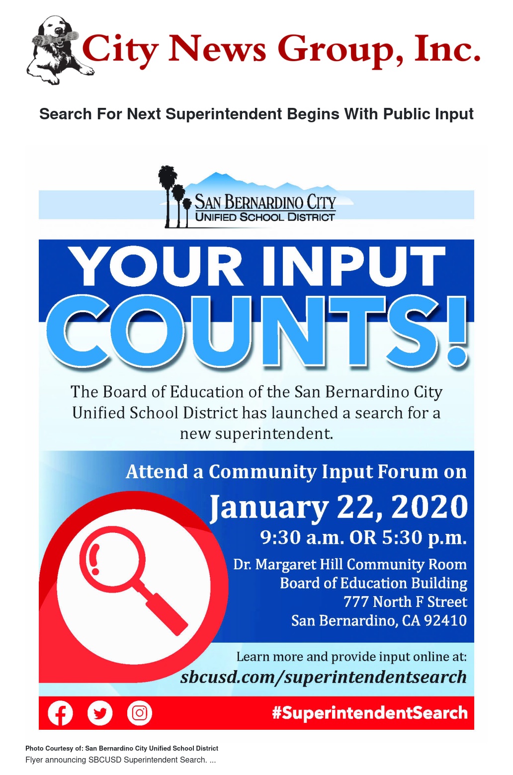 The community will be asked to share input about the desired characteristics for the next leader of the San Bernardino City Unified School District. Information shared during the meetings will guide the Board of Education in the recruitment and selection process.