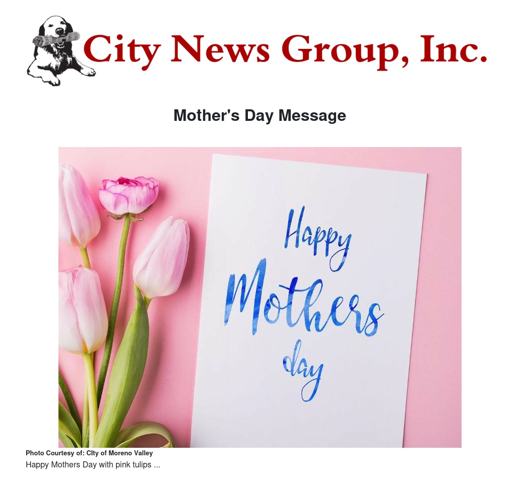On behalf of the city of Moreno Valley, I extend my warmest wishes to all mothers and mother figures out there doing what you do, day in and day out, to keep your families safe and healthy. Your love and devotion enrich our lives in countless ways.