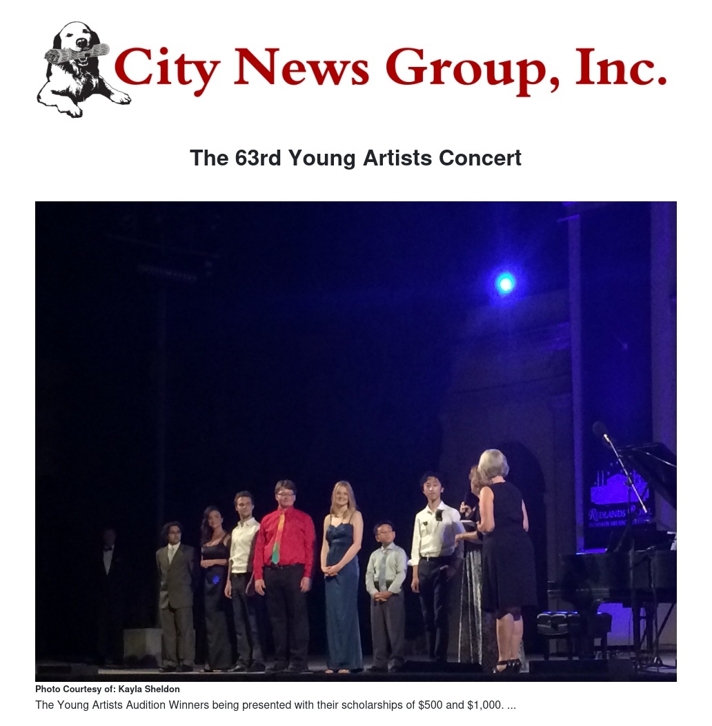 The emcee for the evening Eric Gruenler started the night off giving the audience a brief introduction, and welcoming everyone to the 63rd Annual Redlands Bowl Young Artists Auditions Winners Concert. He invited Jeff Waldron, the chairman of the board of Redlands Community Music Association and their executive director out on stage to give thanks to all the associates that helped make the night happen.