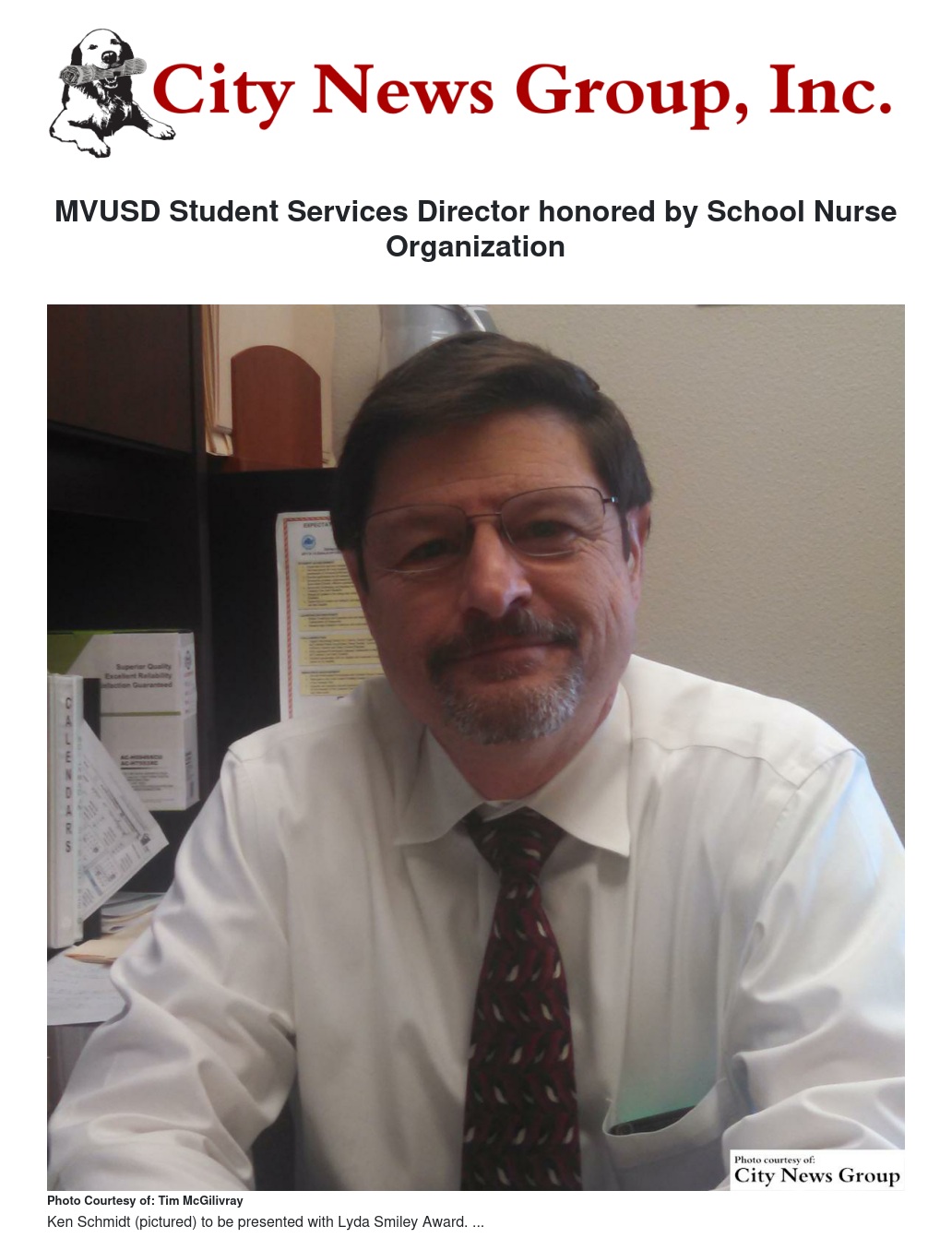 In recognition of his support for the work of school nurses, MVUSD Director of Student Services Ken Schmidt will receive the Lyda Smiley Award from the San Bernardino-Riverside Counties School Nurse Organization at a ceremony held next month in Temecula.