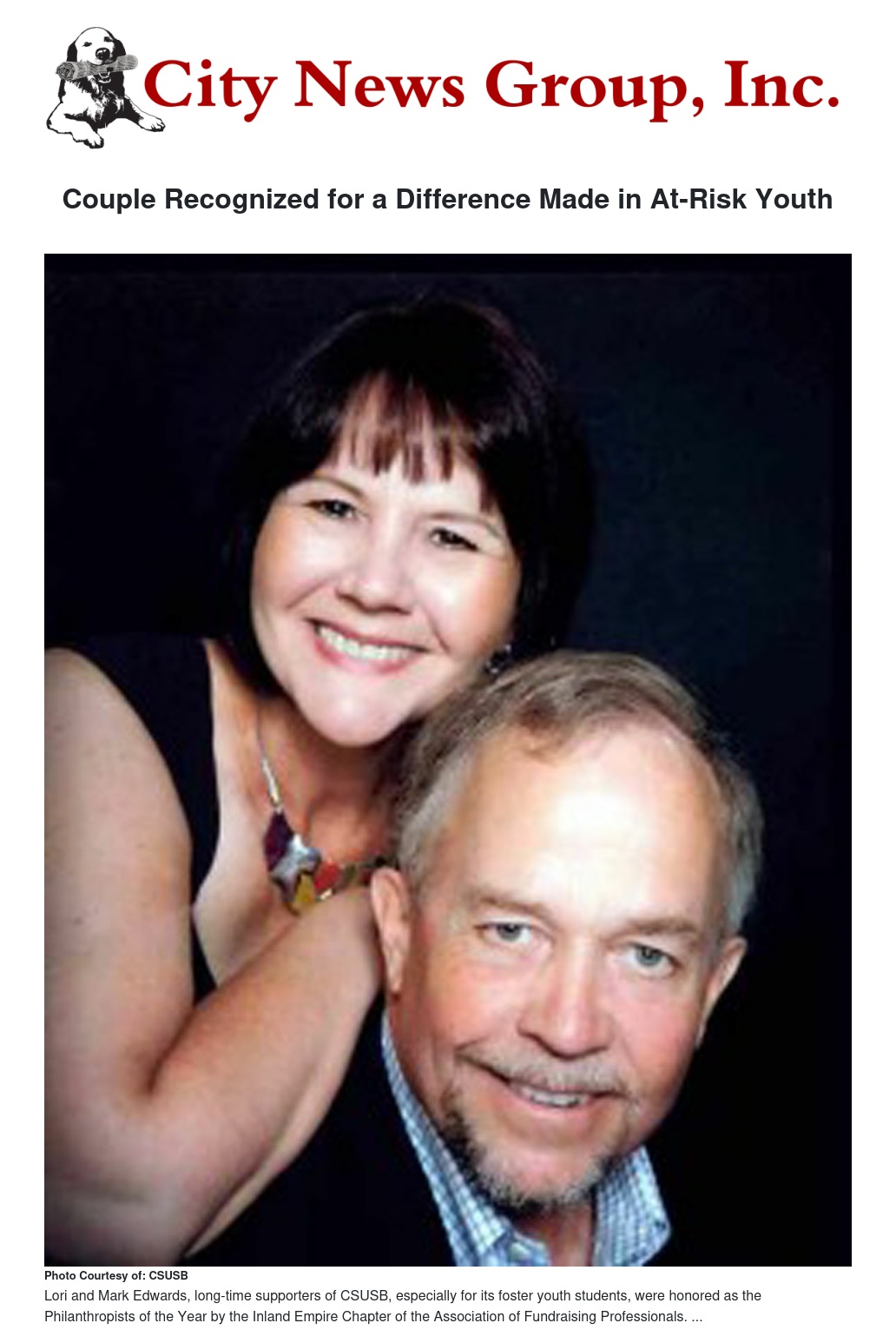 Mark and Lori Edwards, long-time supporters of Cal State San Bernardino, especially for its foster youth students, were honored as the Philanthropists of the Year by the Inland Empire Chapter of the Association of Fundraising Professionals.