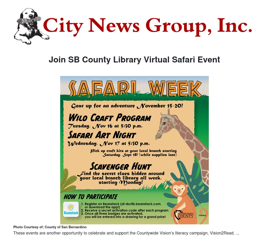 The San Bernardino County Library invites residents to join on Facebook and in the libraries for the Safari Event. Enjoy an amazing week of crafts and a special scavenger hunt through the libraries and earn three digital program activity badges on the library Beanstack app for the chance to win a fantastic themed prize basket.
