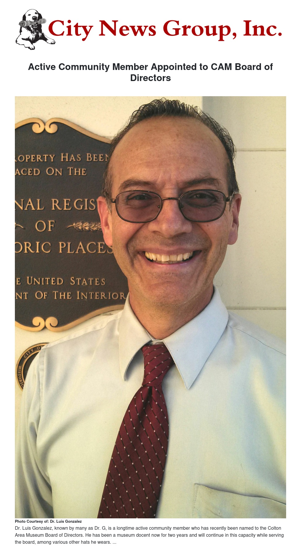 Last weekend at the Colton Area Museum, Dr. Luis S Gonzalez (Dr. G), was officially appointed to the board of directors for 2014. The museum is located at 380 N. La Cadena Ave, and includes an organization made up of a board of directors, volunteer docents and a general membership.
