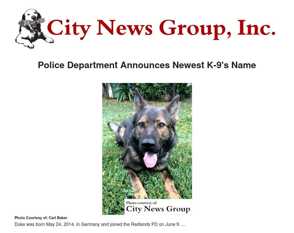 Duke was born May 24, 2014, in Germany and joined the Redlands PD on June 9. He began training on June 20 as an apprehension dog and is also being cross-trained in narcotics detection.