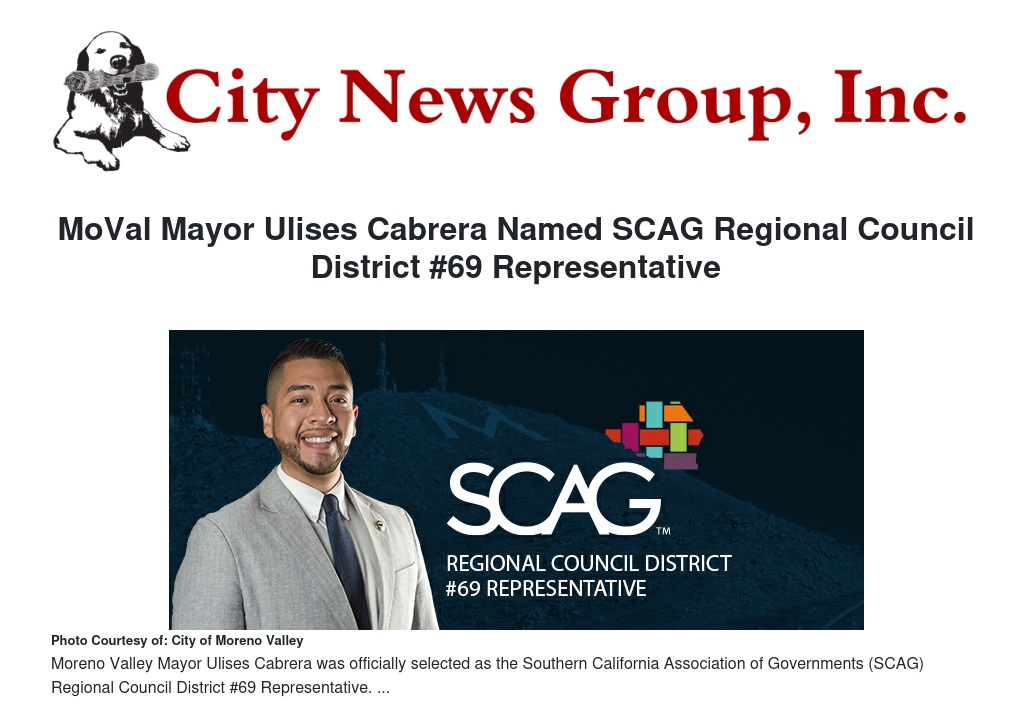 Moreno Valley Mayor Ulises Cabrera was officially selected as the Southern California Association of Governments (SCAG) Regional Council District #69 Representative. Mayor Cabrera will begin his two-year term in May 2025, serving through May 2027, and will represent both Moreno Valley and the City of Perris.