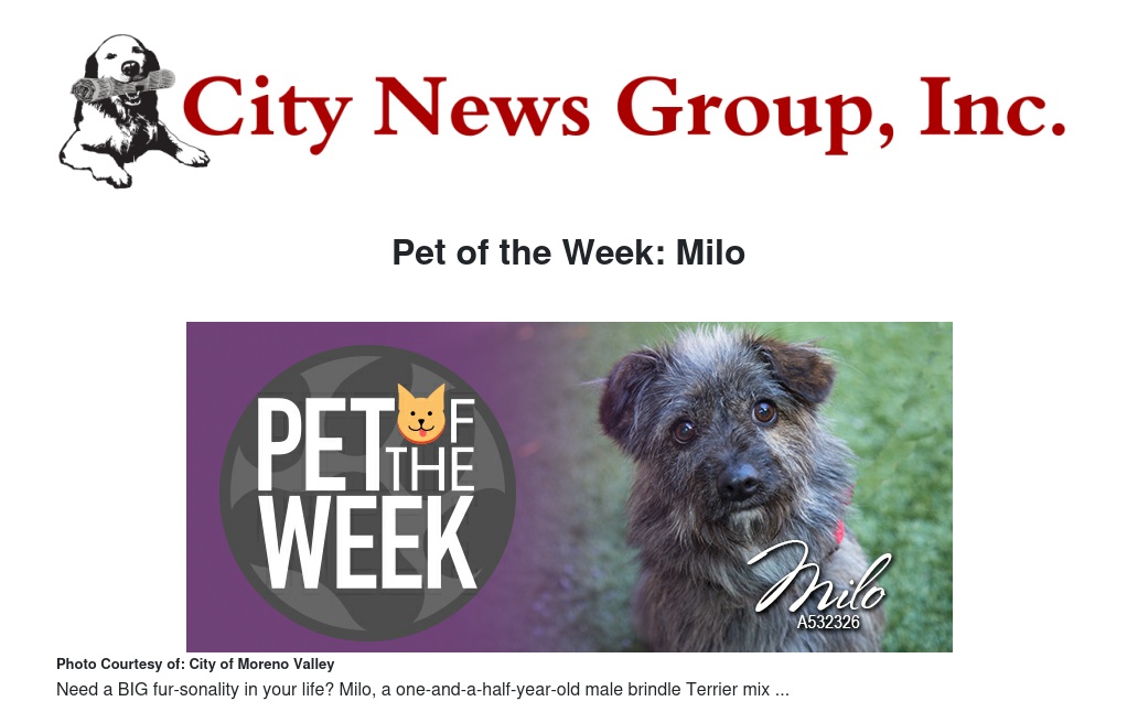 If you would like to make Milo or any pet from the Moreno Valley Animal Shelter part of your family, please contact the Moreno Valley Animal Shelter at 951.413.3790 or visit moval.org/pets.