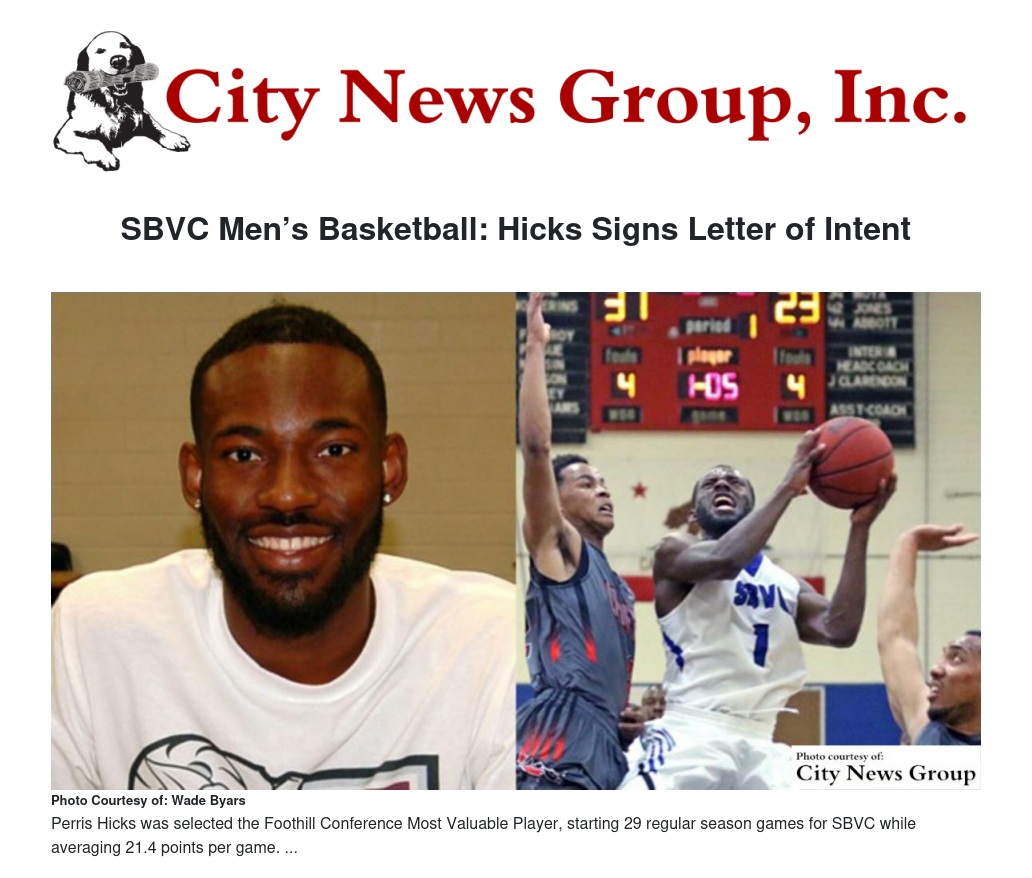 SAN BERNARDINO >> San Bernardino Valley College (SBVC) Men's Basketball sophomore guard Perris Hicks (Pasadena Blair) has signed a letter of intent with Fordham University.