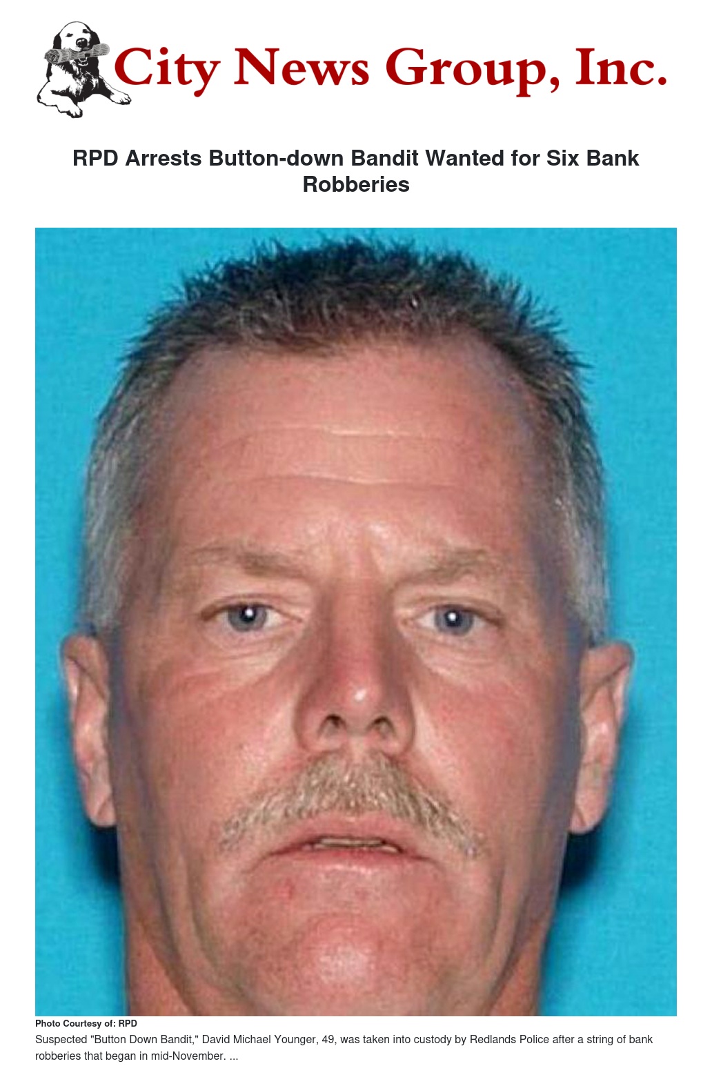 Redlands Police arrested a prolific robbery suspect the FBI dubbed the “Button-down Bandit,” who is alleged to have held up six Southern California banks since Nov. 15.