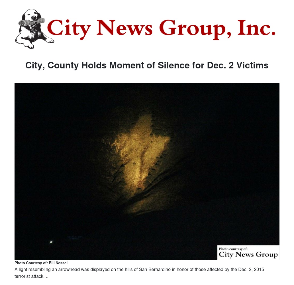 A light resembling an arrowhead was displayed on the hills of San Bernardino in honor of those affected by the Dec. 2, 2015 terrorist attack.