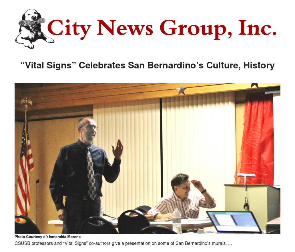 The San Bernardino Paul Villaseñor Branch library hosted Vital Signs, a collaborative project by Professors Juan Delgado and Thomas McGovern, who teach at Cal State University, San Bernardino. The book includes poetry by Juan Delgado and photography by Thomas McGovern, who started photographing murals in San Bernardino in 2006 and shot these murals in his spare time through 2012.