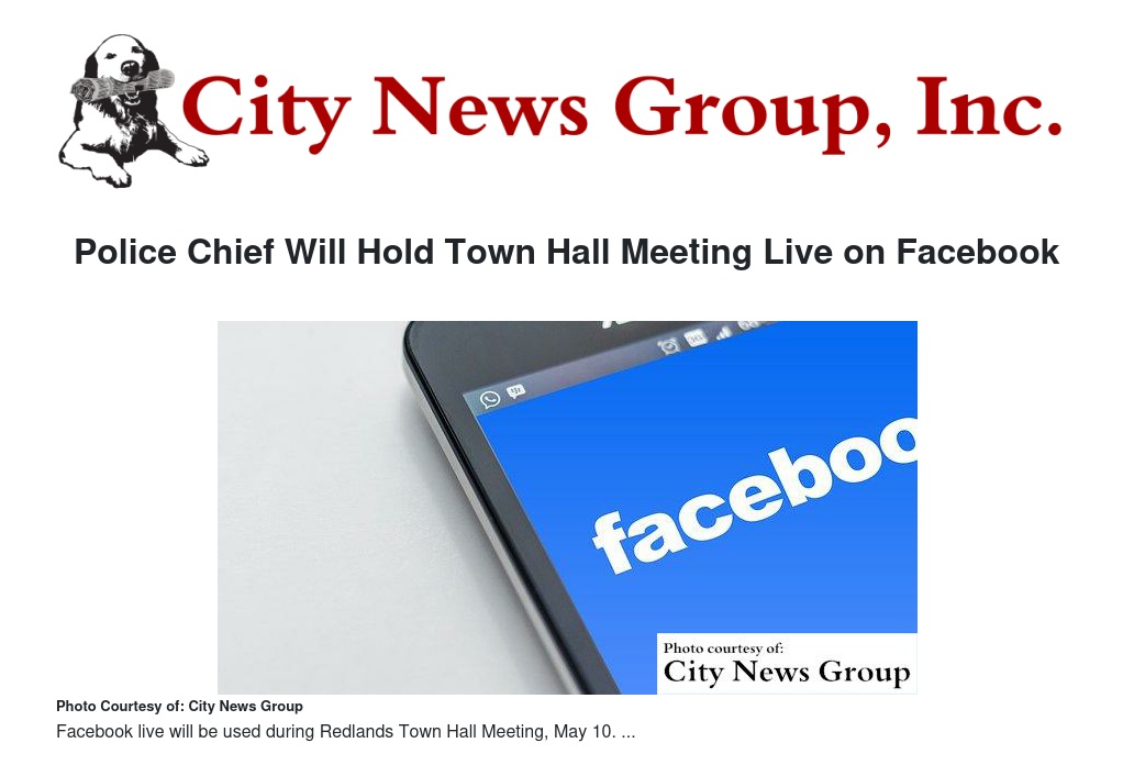 Chief Garcia’s regular Town Hall meetings are part of the Redlands Police Department’s efforts to promote citizen involvement, in keeping with the City of Redlands’ commitment to transparency in every aspect of city government. By taking questions via Facebook, the department hopes to be able to better accommodate residents and address concerns of those who have other commitments or obligations but wish to have specific questions answered.