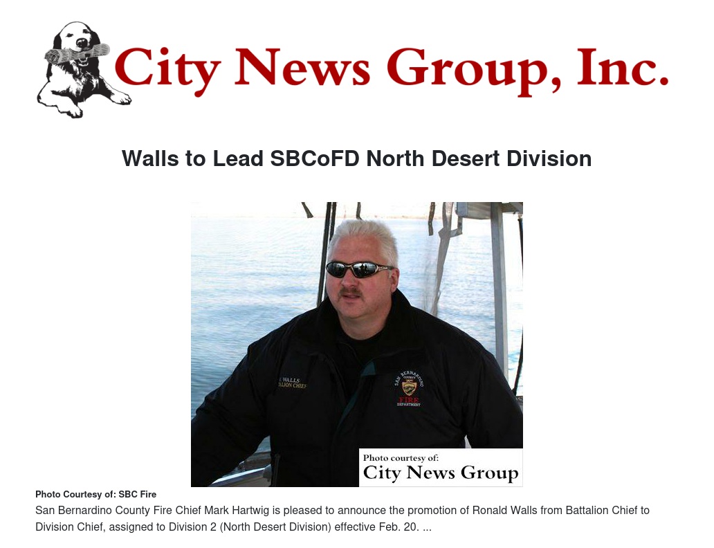 San Bernardino County Fire Chief Mark Hartwig is pleased to announce the promotion of Ronald Walls from Battalion Chief to Division Chief, assigned to Division 2 (North Desert Division) effective February 20. As Division Chief, Walls will take responsibility for rescue operations, fire and emergency medical response in the North Desert region.