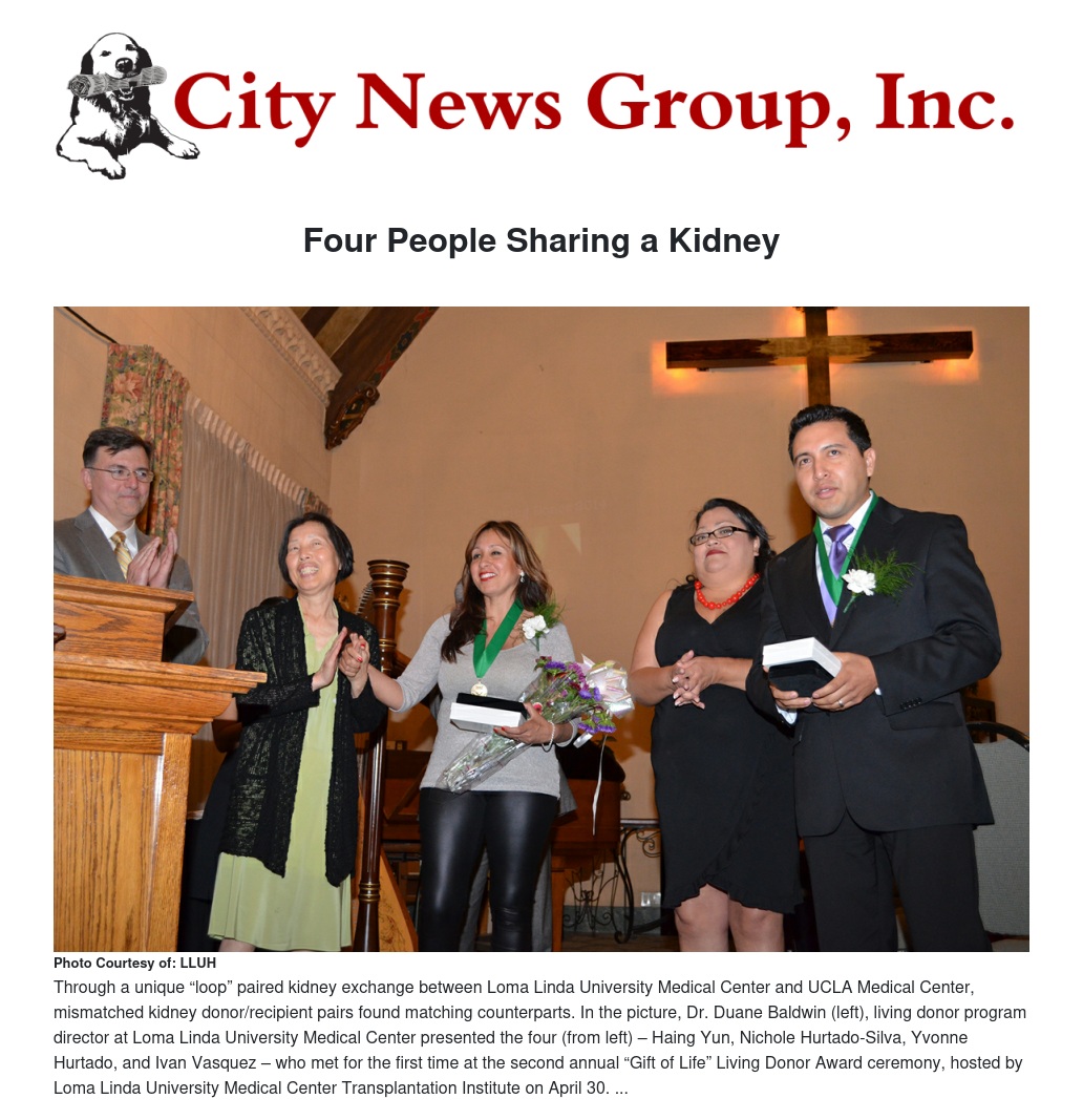 All are now doing well, and met for the first time at the second annual “Gift of Life” Living Donor Award ceremony, hosted by LLUMC Transplantation Institute. The four were presented before over 140 people, including other 2013 kidney donor/recipient pairs, at the gathering held in Riverside, where the living kidney donors were honored with awards.