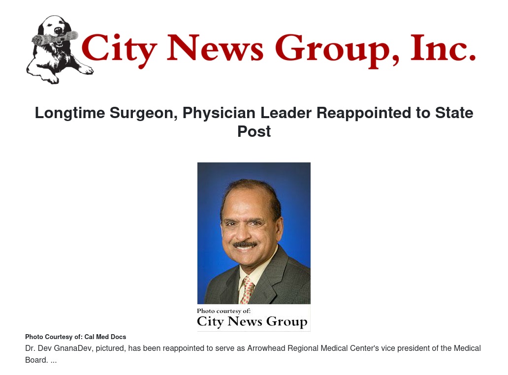 Dr. Dev GnanaDev, a longtime surgeon and nationally recognized leader in health care, has been reappointed by Gov. Jerry Brown to the Medical Board of California. Dr. GnanaDev, associate medical director and chairman of the Department of Surgery at Arrowhead Regional Medical Center, was initially appointed to the Medical Board in 2011. In July 2014, he was elected to the post of Medical Board vice president. Dr. GnanaDev’s reappointment is for four years.