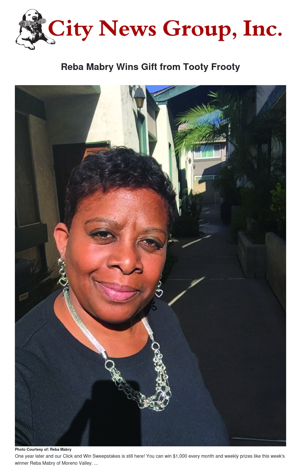 This week’s winner of one of the weekly prize giveaways is Reba Mabry from Moreno Valley. Mabry heard about the Click-N-Win Sweepstakes by reading about it in the Moreno Valley City News. Mabry has earned herself a $30 gift certificate to Tooty Frooty!