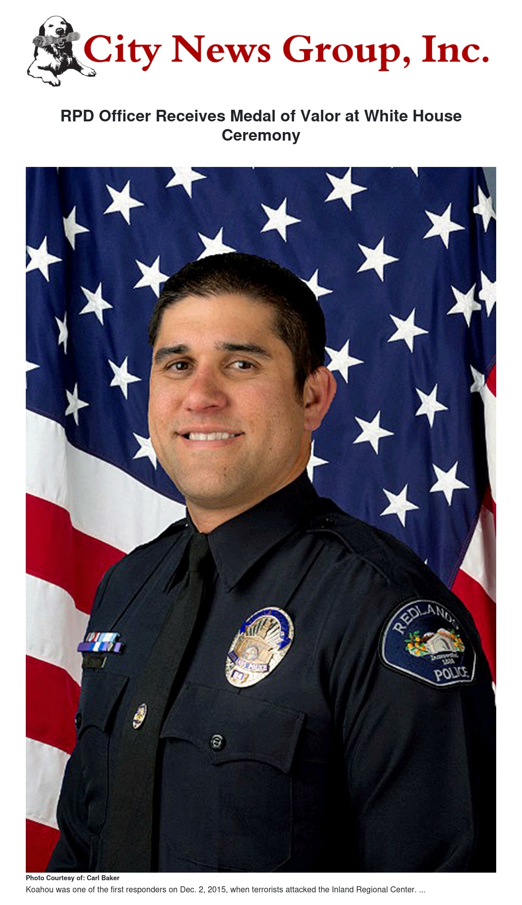 Redlands Police Officer Nick Koahou received the Medal of Valor Tuesday, Feb. 20, from President Donald Trump during a White House ceremony honoring a dozen first responders. Officer Koahou received the Medal of Valor in recognition of his actions during the Dec. 2, 2015, terrorist attack on the Inland Regional Center in San Bernardino.