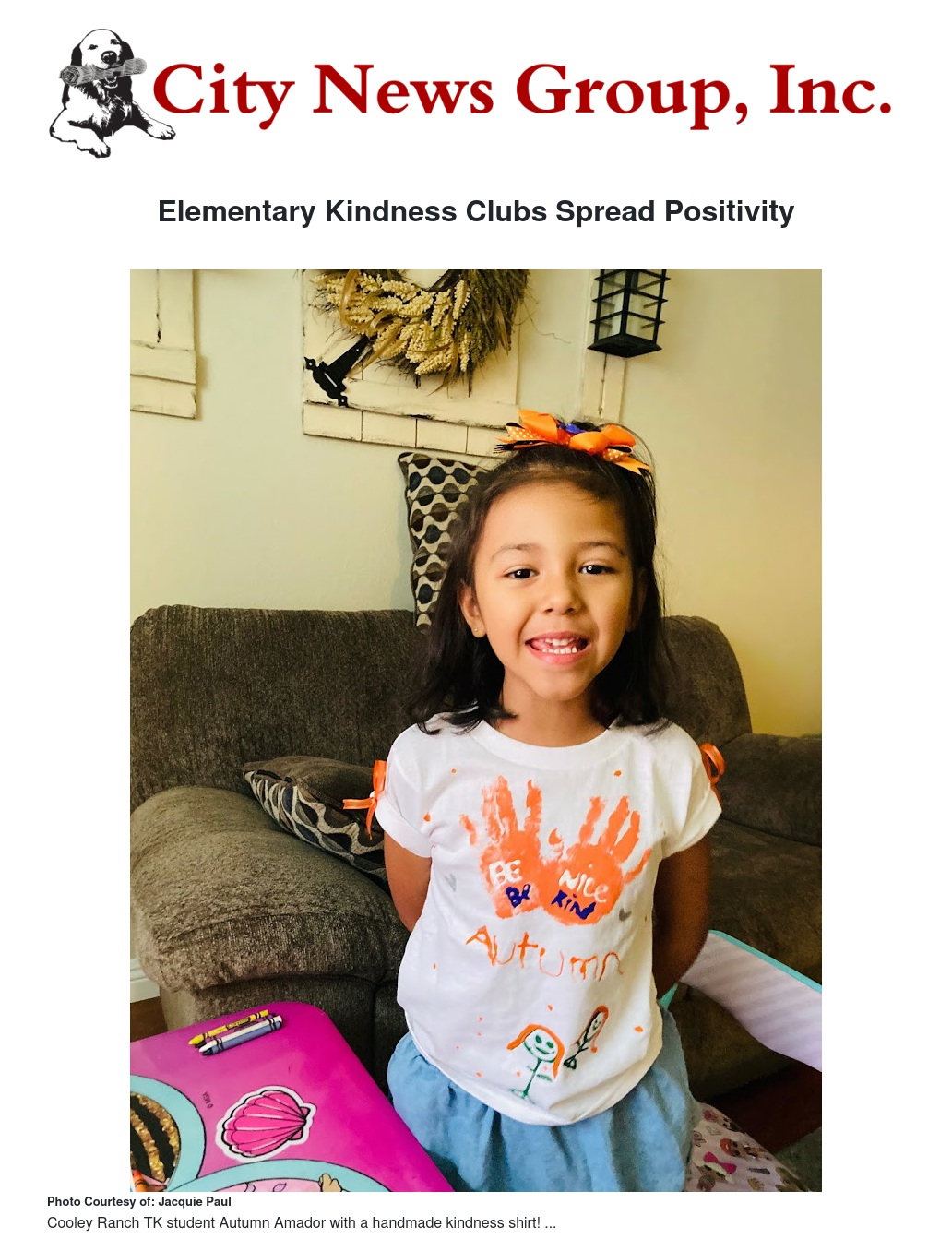 Added Cooley Ranch Elementary School Principal Lorilee Martin, “Our Kindness Club members have truly blossomed into Kindness Ambassadors. They actively promote kindness each and every day which positively impacts our school culture. This is extraordinarily meaningful for our students, families, and community during the pandemic.”