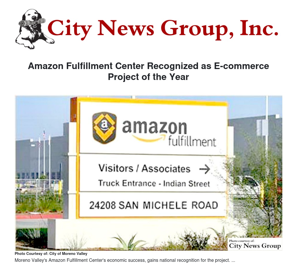 "This project was a true public private partnership between Trammell Crow Company, Amazon and the city of Moreno Valley. We are very happy to have this state-of-the art facility in our city and we congratulate Amazon and Trammell Crow on this prestigious award," said Mayor Jesse Molina.