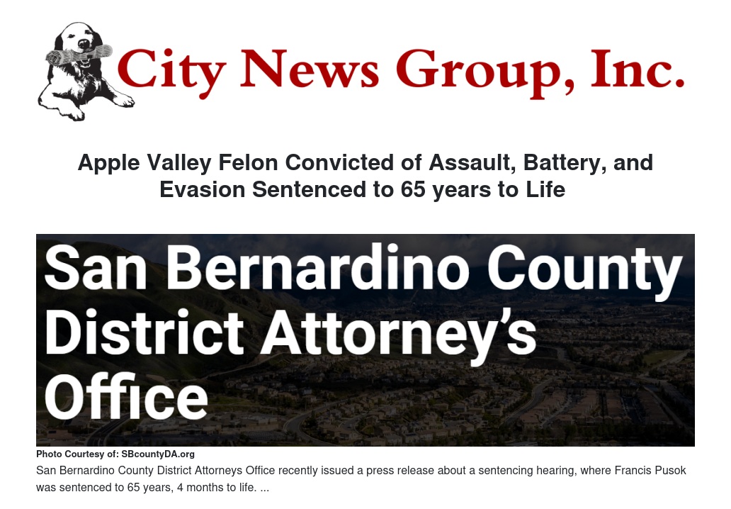 Apple Valley Felon Convicted of Assault, Battery, and Evasion Sentenced to 65 years to Life  by Cameron Lindsey - City News Group, Inc.