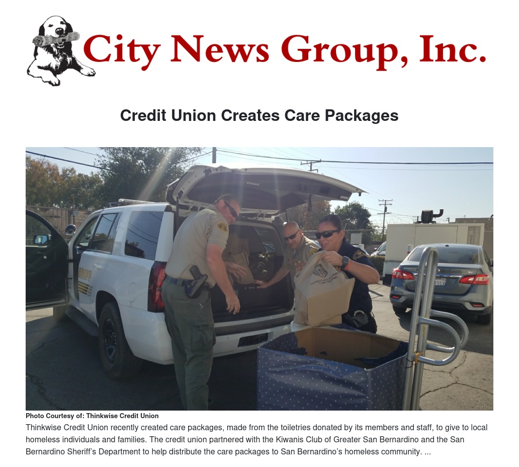 Thinkwise Credit Union announced that it created care packages, made from the toiletries donated by its members and staff, to give to local homeless individuals and families. The credit union partnered with the Kiwanis Club of Greater San Bernardino and the San Bernardino Sheriff’s Department to help distribute the care packages to San Bernardino’s homeless community.