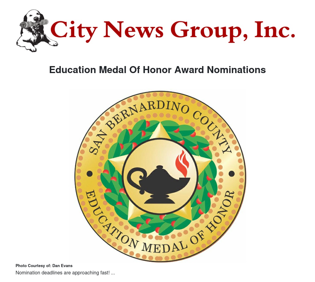 The San Bernardino County Education Medal of Honor is looking for nominations for this year's awards that honor outstanding contributions to public education by volunteers/service groups, business/government partners, educators and alumni. The deadline to submit entries is Feb. 19.