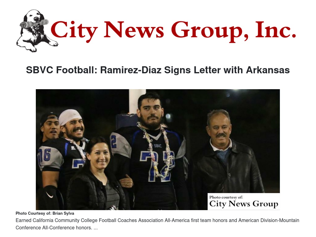 SBVC Football sophomore offensive lineman Paul Ramirez-Diaz (Rialto H.S.) has signed a letter of intent with the University of Arkansas.