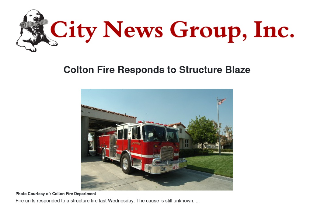 Colton Fire units responded to a commercial structure fire in the Plaza Las Glorias Shopping Center on Jan. 8, to find light smoke conditions with fire alarms sounding and water flowing from the fire sprinkler system.
