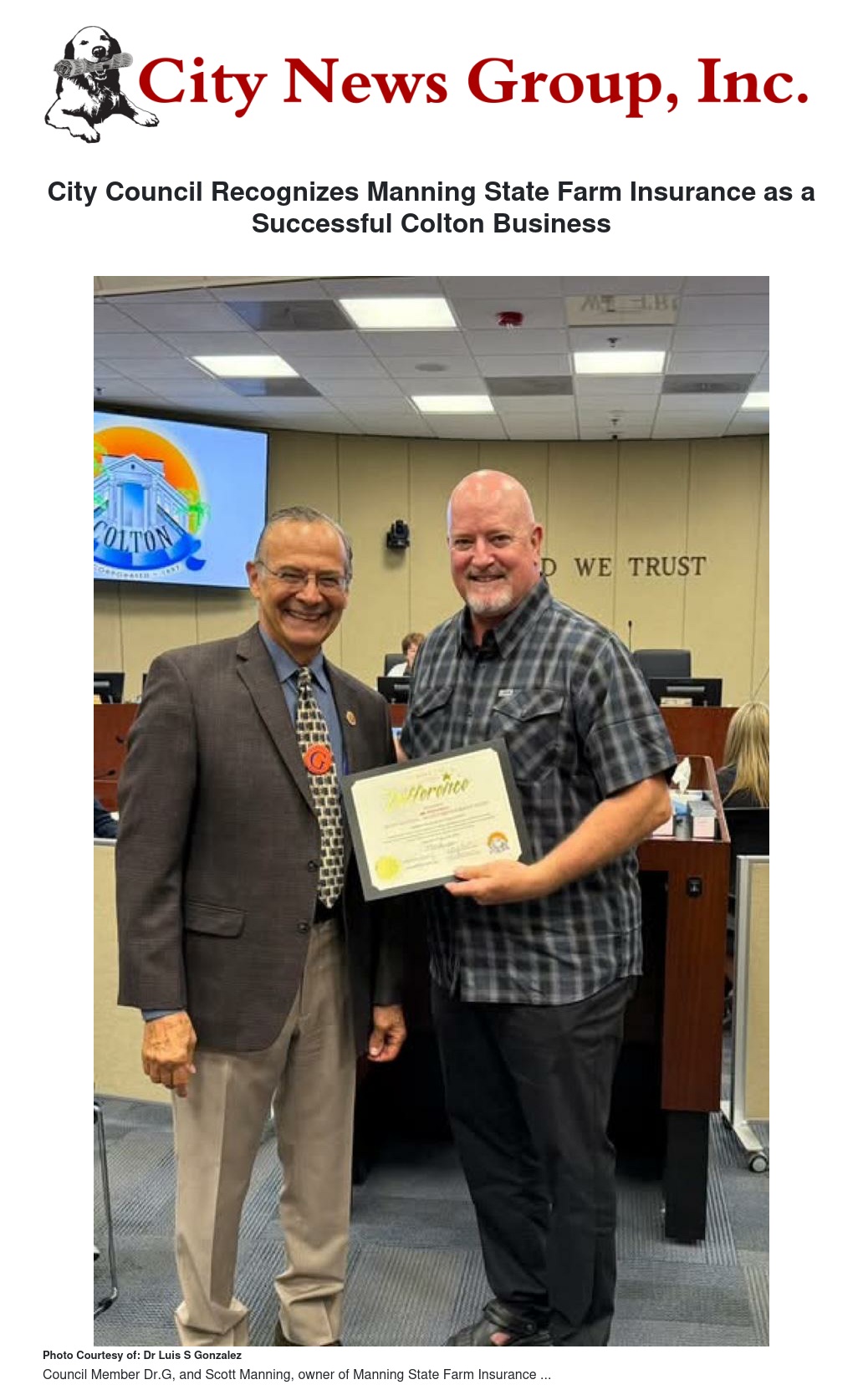 City Council Recognizes Manning State Farm Insurance as a Successful Colton Business by Dr Luis S Gonzalez - City News Group, Inc.