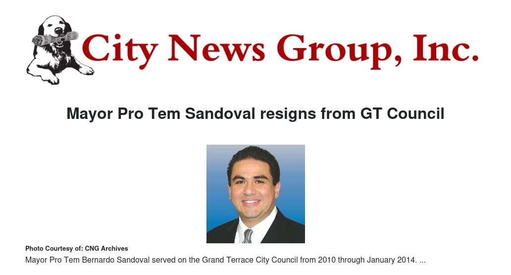 “This new position will require an extraordinary amount of time to get acclimated to and I don’t want to jeopardize the residents of Grand Terrace during my learning curve," Sandoval said. "As I have stated in the past, I ran for city council because I really have a passion and deep concern for the community of Grand Terrace and I believe if the community is to grow it must be able to let go of the past and focus on the future, which in turn will provide great rewards.”