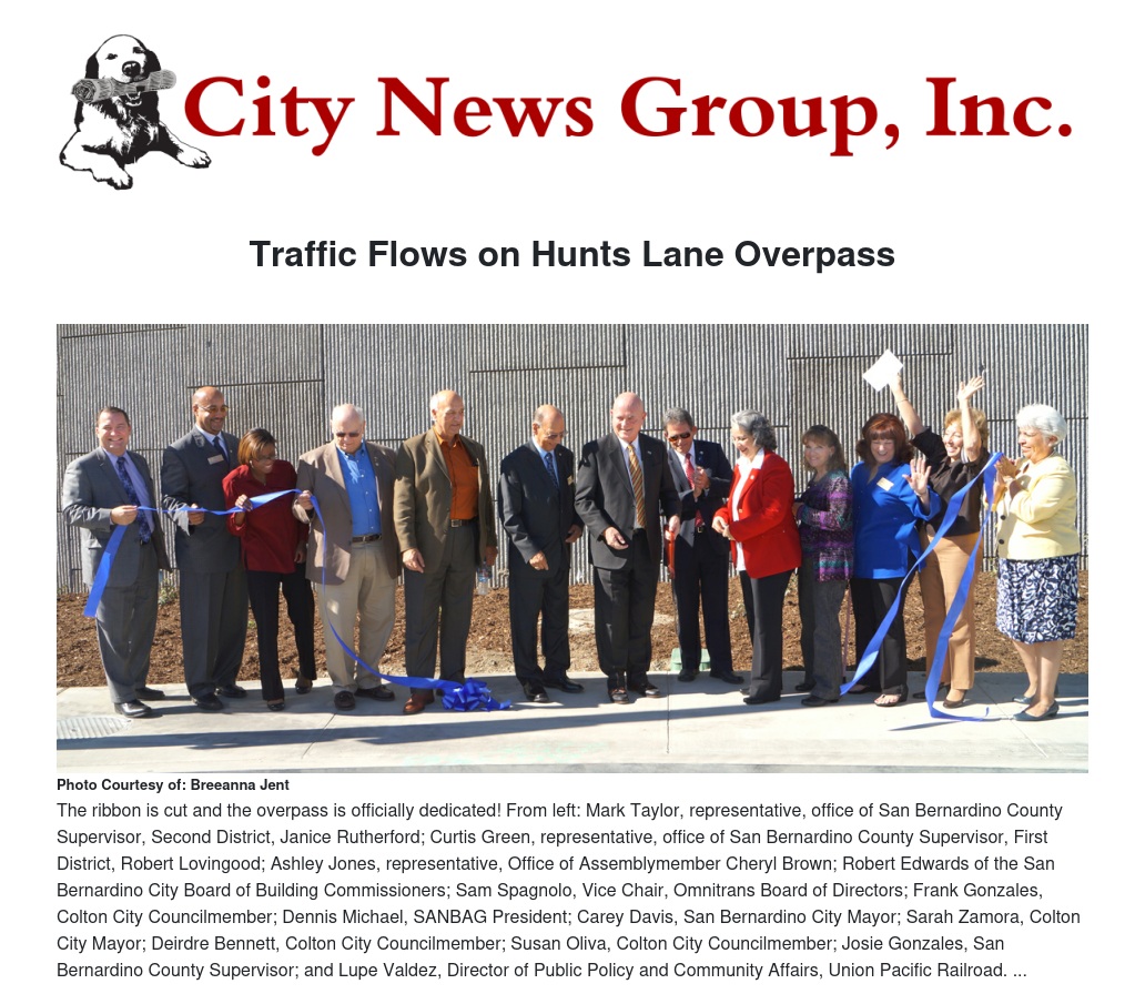 A train bell sounded quietly on the rail connecting the cities of Colton and San Bernardino Thursday morning, Nov. 6, as a crowd of residents, business owners, project personnel and local leaders gathered at the base of the newly constructed Hunts Lane overpass to dedicate the new bridge completed after nearly two years of construction.