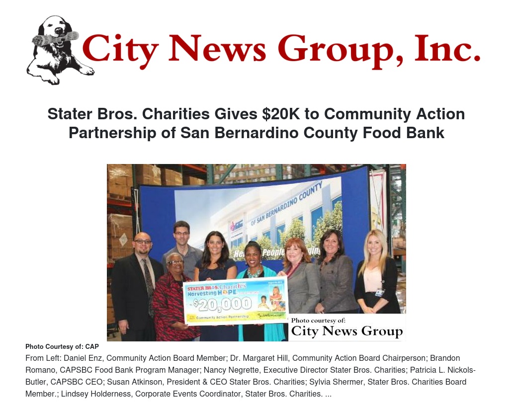 CAPSBC CEO Patricia L. Nickols-Butler stated, "The support of Stater Bros. Charities has without a doubt profoundly impacted hunger in our communities. We are very grateful for their on-going support. In addition to monetary support, Stater Bros. Markets provides over a million pounds of food annually helping us serve thousands of San Bernardino County residents in need of food assistance."