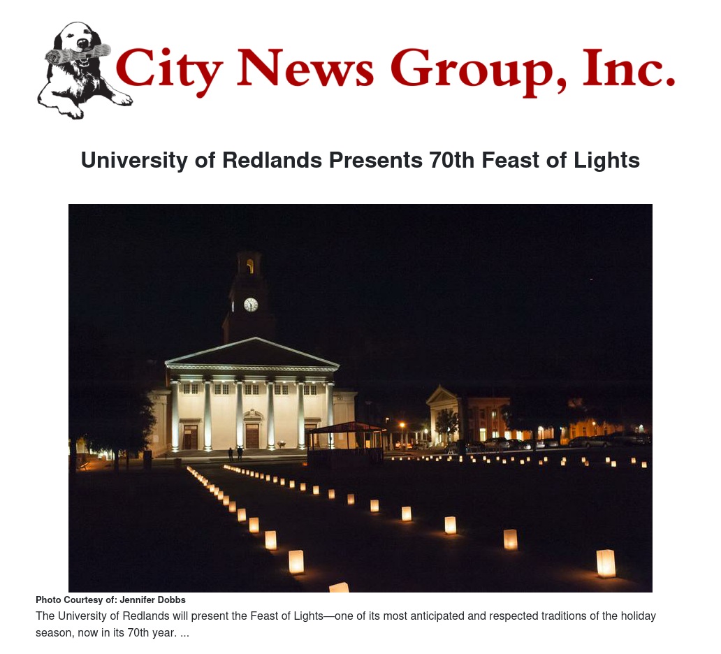 REDLANDS>> The University of Redlands will present the Feast of Lights, one of its most anticipated and respected traditions of the holiday season, now in its 70th year, Dec. 1-4, 2017 in the historic Memorial Chapel on the University of Redlands campus.