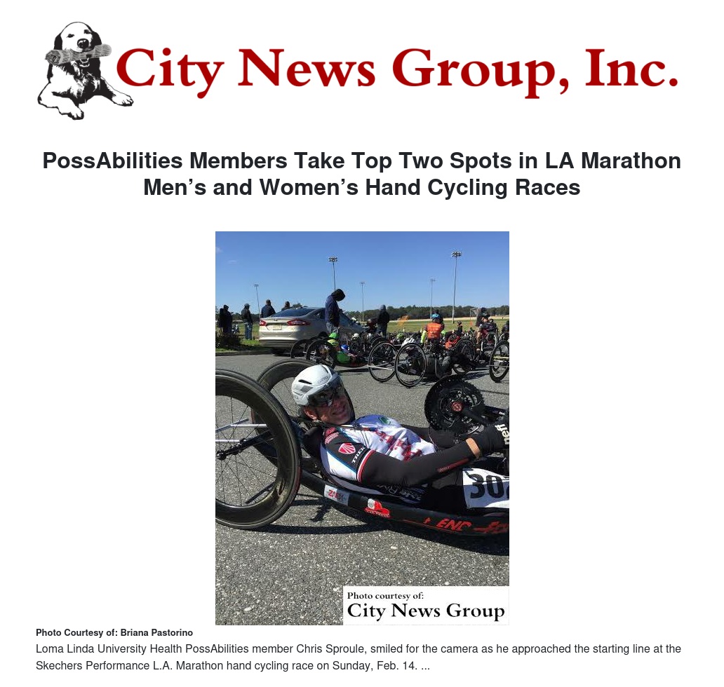Loma Linda University Health PossAbilities members Jenna Rollman and Chris Sproule placed in the top two in the Skechers Performance Los Angeles Marathon hand cycling races in the women’s and men’s divisions, respectively, on Sunday, Feb. 14.