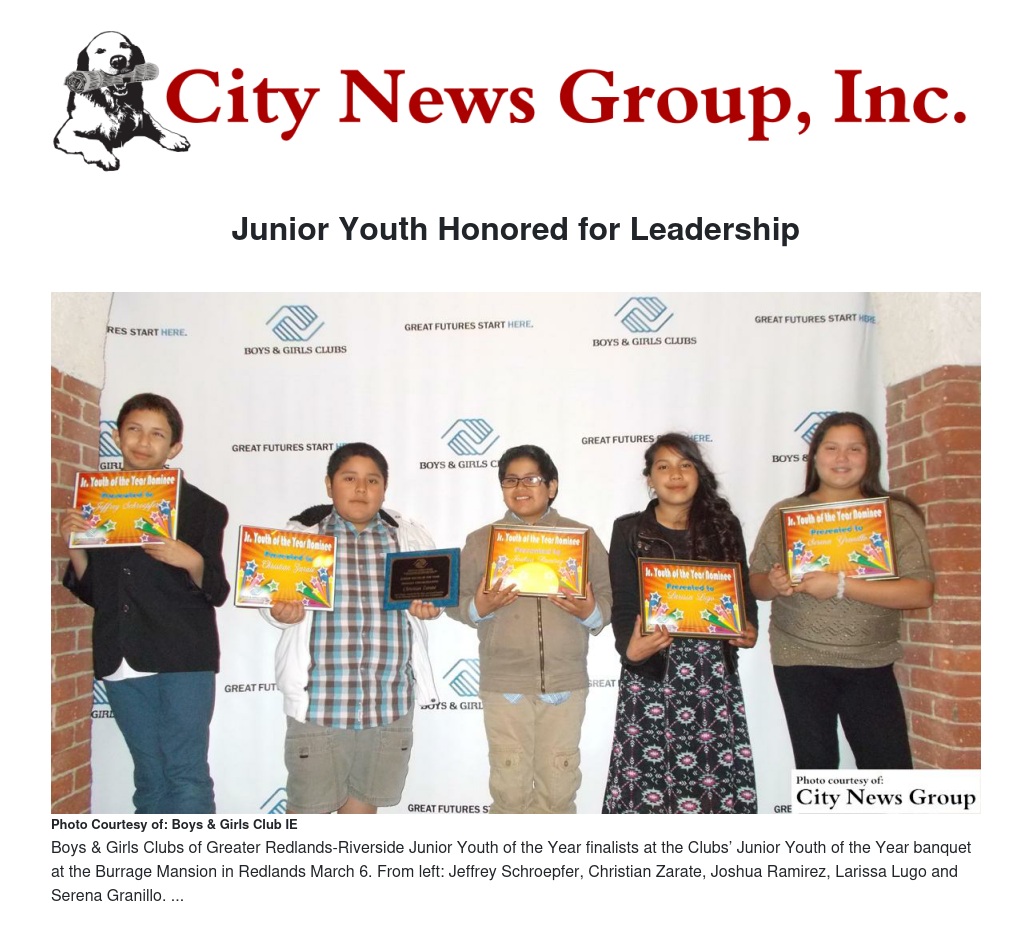 Junior Youth of the Year nominees were honored by the Boys & Girls Clubs of Greater Redlands-Riverside at a banquet at the Burrage Mansion earlier this month.