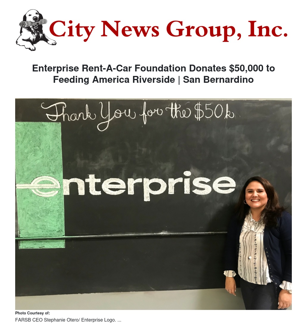 Feeding America Riverside | San Bernardino (FARSB) received $50,000 from the Enterprise Rent-A-Car Foundation to address food insecurity in Riverside and San Bernardino Counties. The donation is part of Enterprise’s Fill Your Tank program, which launched in October 2016 to mark Enterprise’s 60th anniversary by providing $60 million to fight hunger globally.