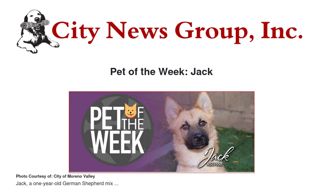 If you would like to make Jack or any pet from the Moreno Valley Animal Shelter part of your family, please contact the Moreno Valley Animal Shelter at 951.413.3790 or visit www.moval.org/pets. |