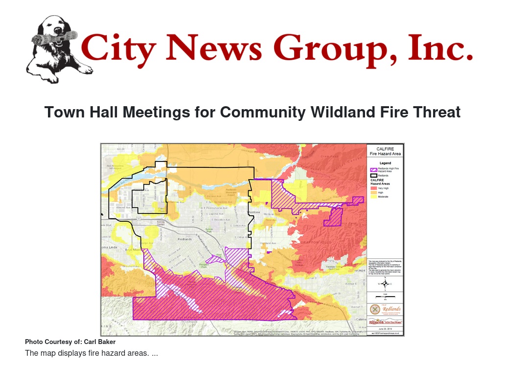 The Redlands Fire Department invites the community to come to one of two Town Hall meetings to learn about the risks of wildland fires and how to be prepared. The meetings will be held at 6 p.m. Thursday, Aug. 15, and at 10 a.m. Saturday, Aug. 17. Both meetings will be held in the Grace Mullen Auditorium at the Redlands High School campus, 840 E. Citrus Ave.
