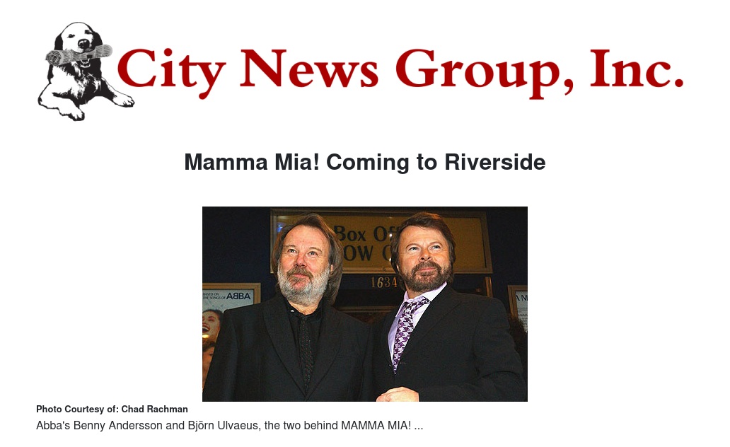 Benny Andersson and Björn Ulvaeus’ MAMMA MIA!, the hit musical based on the songs of ABBA, comes to the Fox Performing Arts Center in Riverside for two shows only.
