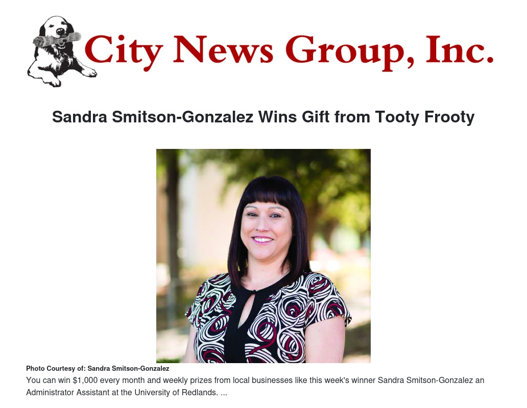 This week’s winner of one of the weekly prize giveaways is Sandra Smitson-Gonzalez from Bloomington. Smitson-Gonzalez has earned herself a $30 gift certificate to Tooty Frooty!