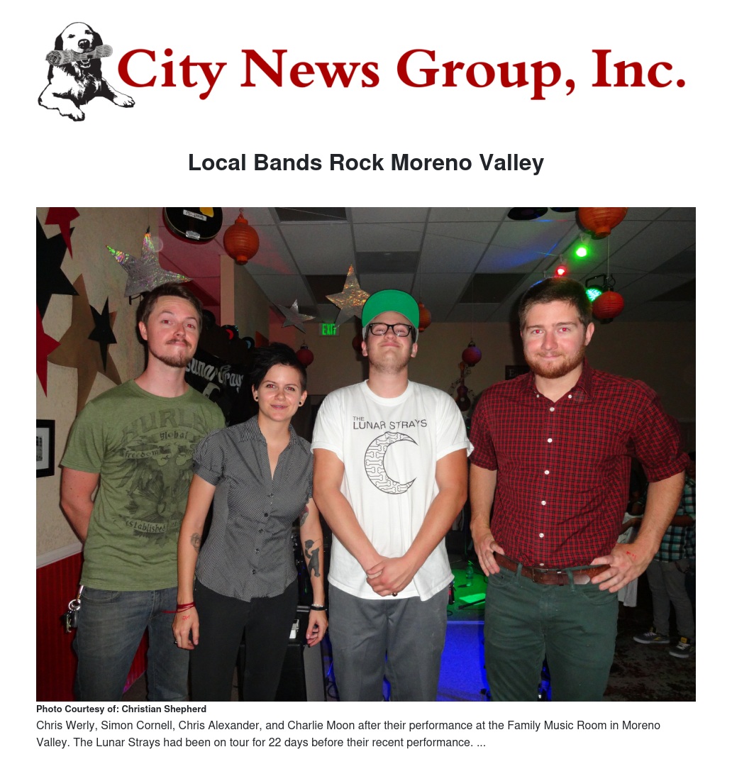 The Lunar Strays consist of four members: Chris Alexander, Charlie Moon, Simon Cornell, and Chris Werly. Chris Alexander and Charlie Moon met at Riverside Polytechnic High School and have been playing together for two years. Chris Werly and Simon Cornell were added to the band about four months ago. The band members are independently inspired from a range of music from heavy metal to Amanda Palmer, lead singer of The Dresden Dolls and successful solo artist.