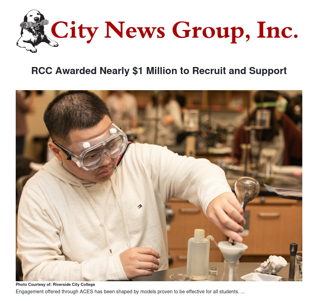 This grant will fund scholarships for students. Each scholar will receive a $7,500 scholarship per year, for two years, at RCC as well as perform a paid summer internship through a partnership with UC Riverside’s College of Engineering Center for Environmental Research & Technology (CE-CERT). Each cohort of scholars will be supported through the two-year Guided Pathway for Transfer in Chemistry or Biochemistry.