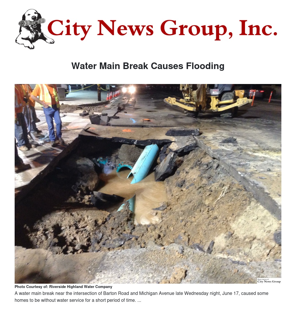 A water main broke at 11:34 p.m. Wednesday, the 17th, in Grand Terrace and was contained sometime between 12:30 and 1 a.m. The water main break originated at Barton Road and Michigan Avenue. Water service was completely restored and roads were reopened by 7:30 p.m. Thursday, June 18, said officials at Riverside Highland Water Company, the city's public water provider.