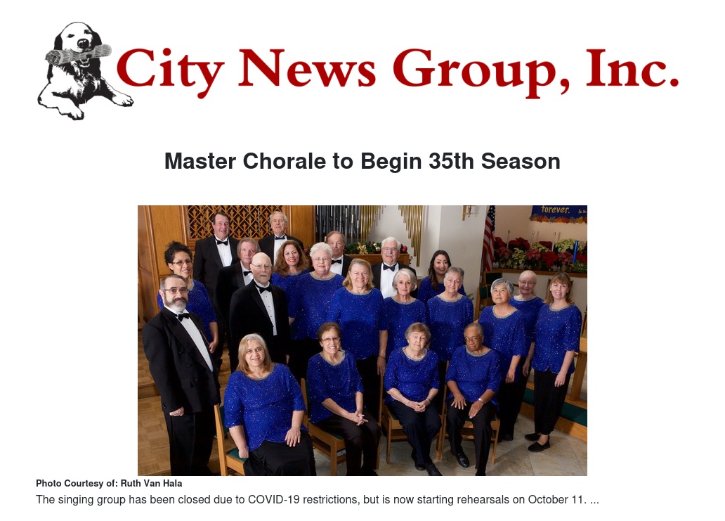 The Moreno Valley Master Chorale will begin preparing for its 35th choral season starting Monday, October 11th. New singers are invited to join us for rehearsals every Monday, 7:00 to 8:30 P.M. at the Shepherd of the Valley Lutheran Church, 11650 Perris Blvd, Moreno Valley, CA 92557, north of Ironwood.