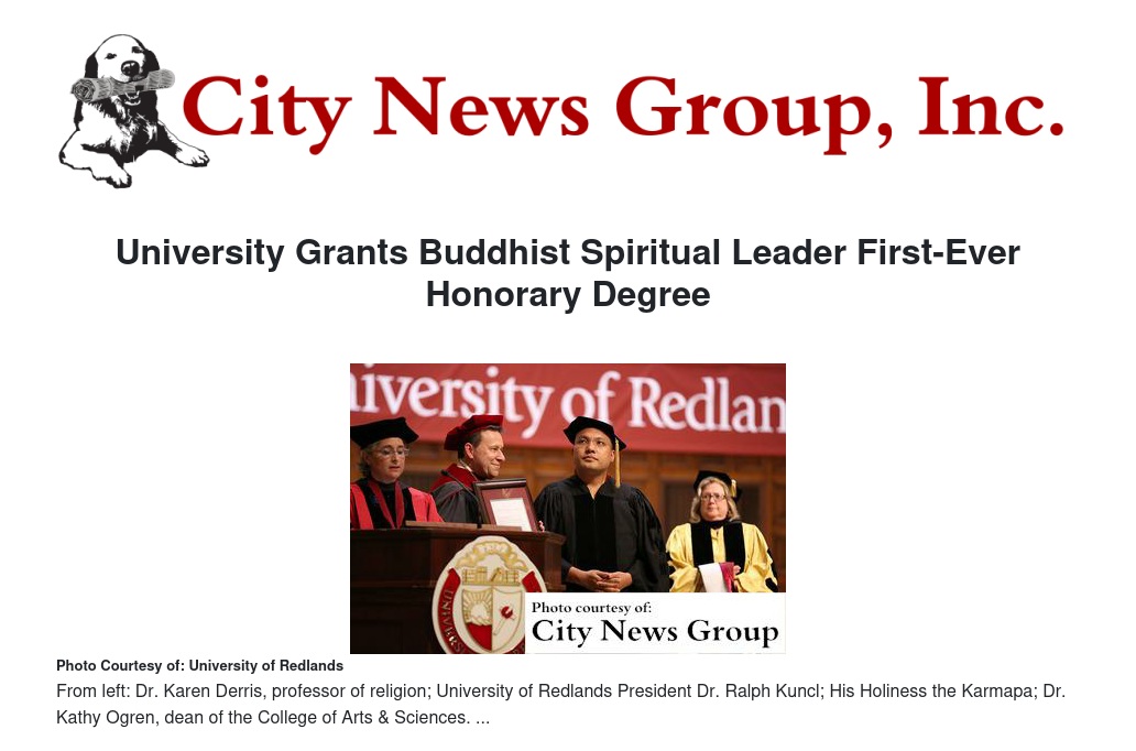 President Kuncl said, “We were thrilled to gather last evening with our University community, special friends and family members, many new visitors to our campus, and untold thousands around the world who viewed live on the Web, to present His Holiness the 17th Gyalwang Karmapa, Ogyen Trinley Dorje, an honorary degree – the first-ever to be conferred upon His Holiness. We thank and honor His Holiness for his kindness to our students who learned from him at his home in India and engaged with him during his visit this week, and for his universal teachings of peace, tolerance and understanding.”