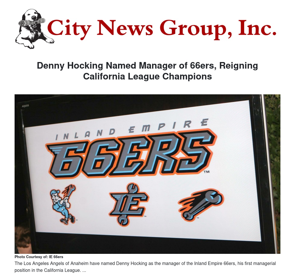 The Los Angeles Angels of Anaheim recently announced that Denny Hocking will be the manager of the Inland Empire 66ers for the 2014 season. This will be Hocking’s first managerial position in the California League. Hocking will be joined by fellow California League newcomer Matt Wise, who takes over as the team’s new pitching coach. Rounding out the staff are returnees Brenton Del Chiaro, Omar Uribe and Sergio Rojas. Del Chiaro will serve as the hitting coach while Uribe and Rojas will return as the athletic trainer and strength and conditioning coach, respectively.