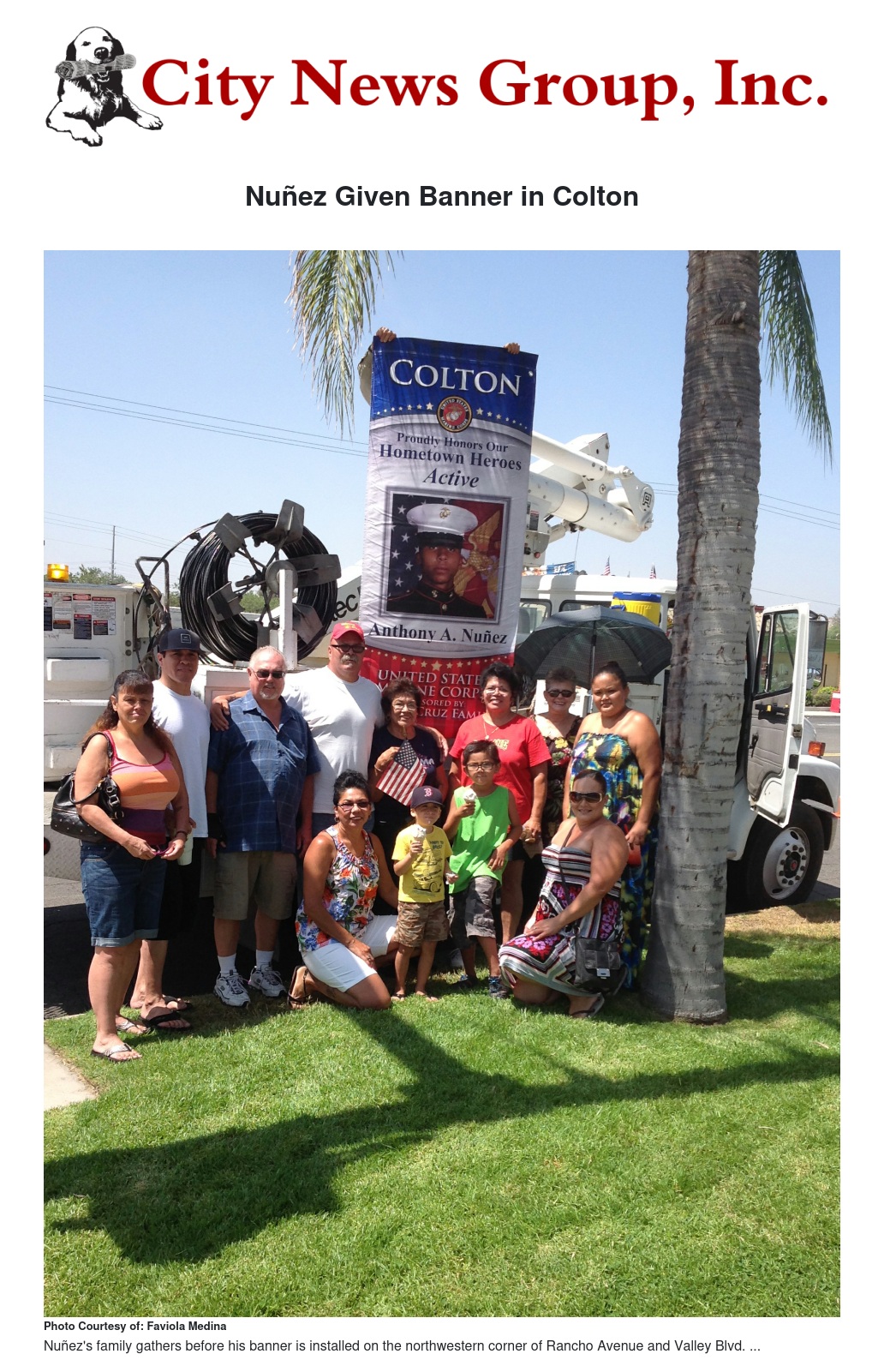 Anthony A. Nuñez, currently serving on active duty in the U.S. Marine Corps, recently had a banner raised at the northwestern corner of Rancho Avenue and Valley Blvd. in Colton, in his honor.