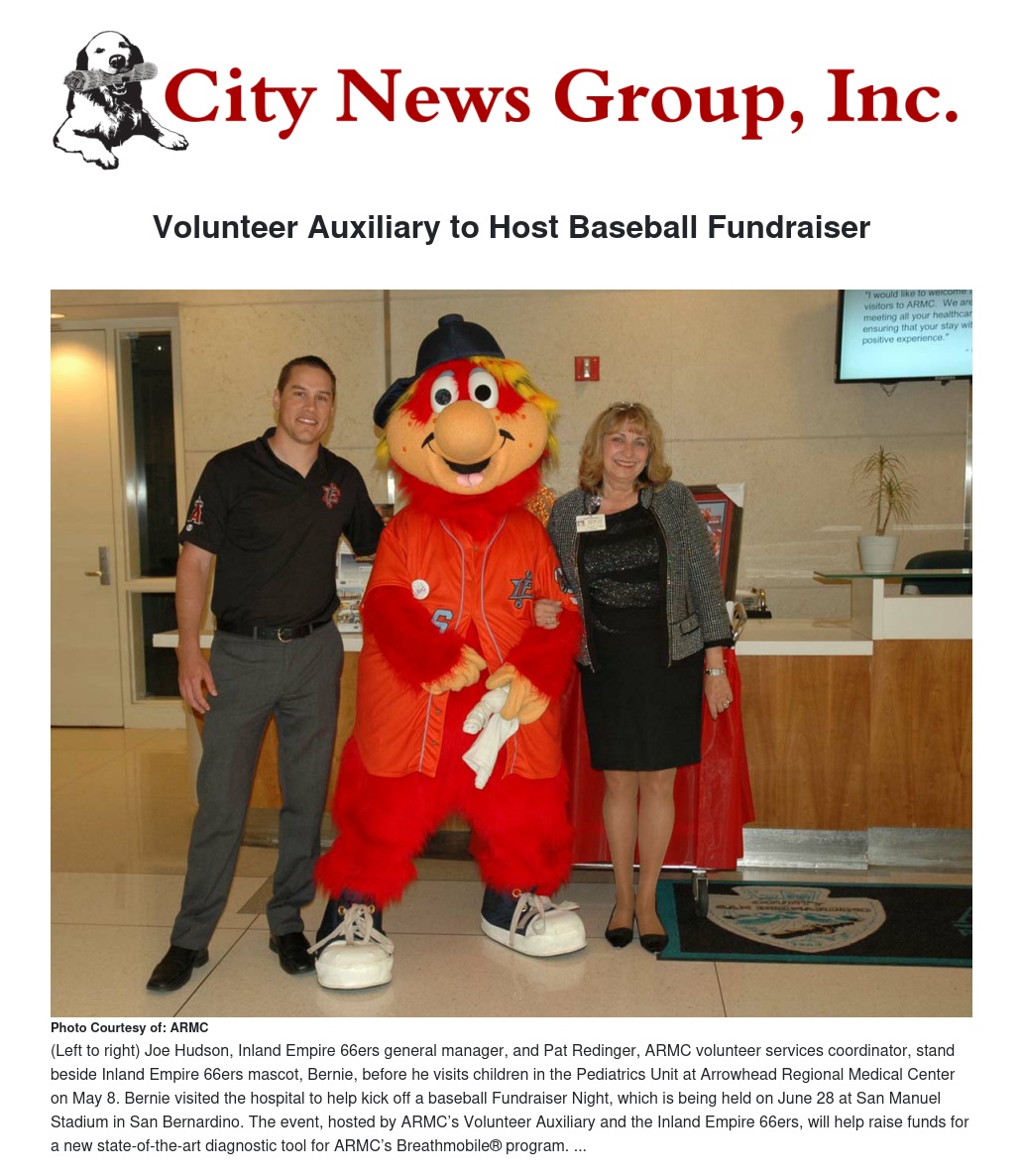 Inland Empire 66ers mascot, Bernie, visited children at Arrowhead Regional Medical Center (ARMC) on May 8, to help kick off a baseball Fundraiser Night, which is being hosted by ARMC’s Volunteer Auxiliary and the Inland Empire 66ers. The event, scheduled for 7:05 p.m. on June 28 at San Manuel Stadium in San Bernardino, will help raise funds for a new state-of-the-art diagnostic tool for ARMC’s Breathmobile® program.