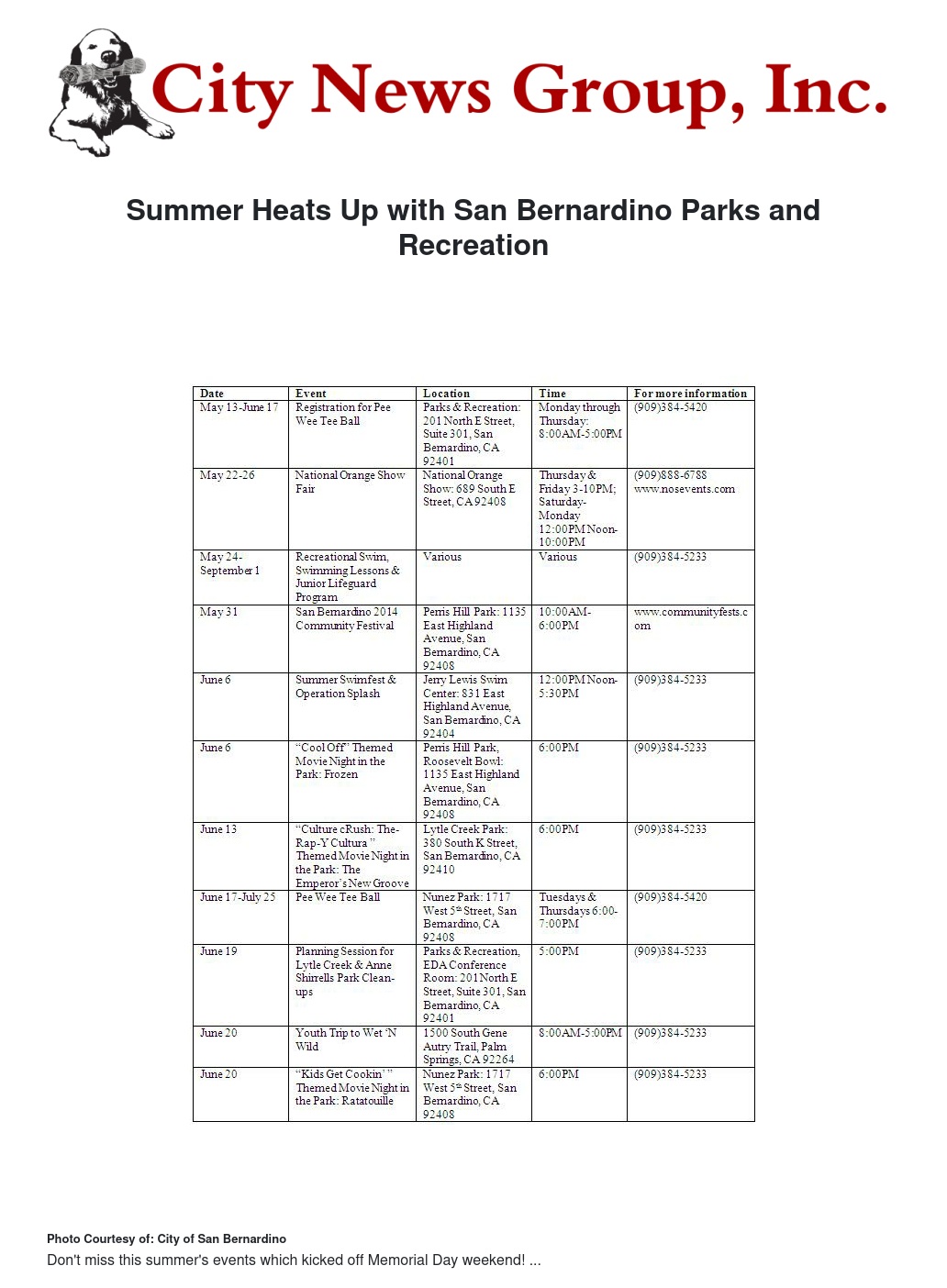 This summer, the City of San Bernardino Parks & Recreation Department is dishing-out fun, family activities that are sure to delight. Events kicked off Memorial Day Weekend and are scheduled to continue through early November. With swim classes, lunch programs, festivals, baseball games and themed movie nights in the park - there is something for everyone to enjoy!